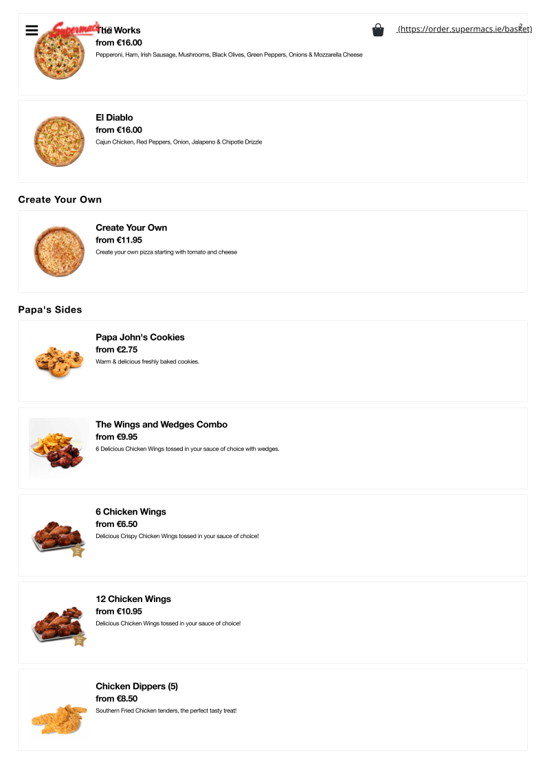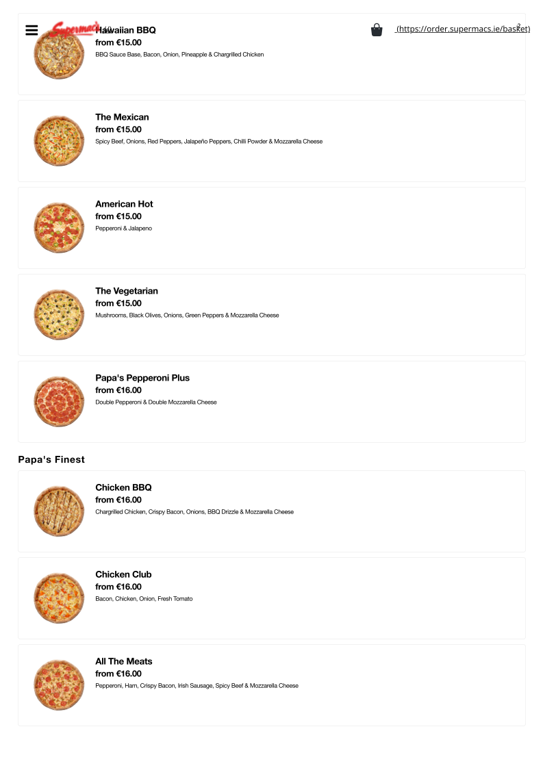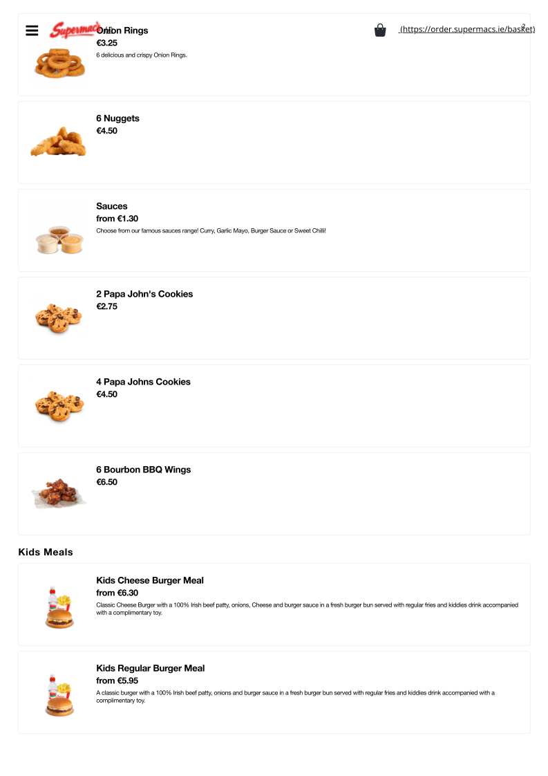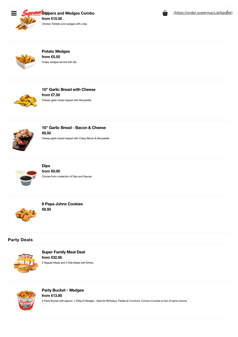 From a reviewer’s perspective, the menu at Supermac’s & Papa John’s Fermoy offers a broad and satisfying mix of fast-food classics and pizza specialties, making it ideal for both quick bites and group meals. The value-driven Papa’s Meal Deals, such as the “The Bargain Bundle Deal” and “Double Deal - Small with 2 Drinks and 4 Cookies”, stand out for their affordability and variety. The burger selection is equally appealing, with hearty options like the “Supermac's 5oz Bacon & Cheese Burger” and the larger “Supermac's 7.5oz Burger”, while chicken lovers can enjoy items like the “Chipotle Chicken Breast Sandwich” or “Chicken Wrap”. Sides such as “Taco Fries” and “Garlic & Cheese Fries” complement the mains well, and classic drinks like “Coca Cola” and “Sprite” round out the meal. On the pizza side, staples like “Margherita Pizza” and more indulgent options like “All The Meats” or “The Works” highlight Papa John’s influence. Desserts including “Hot Muffin & Ice Cream” and “Caramel Sundae” provide a sweet finish. Overall, while individual prices are not explicitly listed, the menu emphasizes variety, recognizable favorites, and value-focused deals that cater to a wide range of tastes.