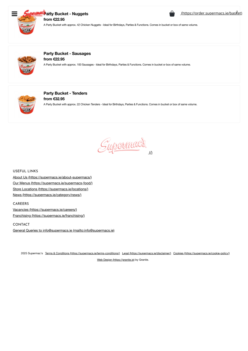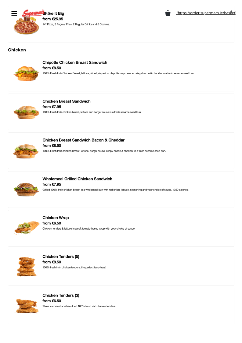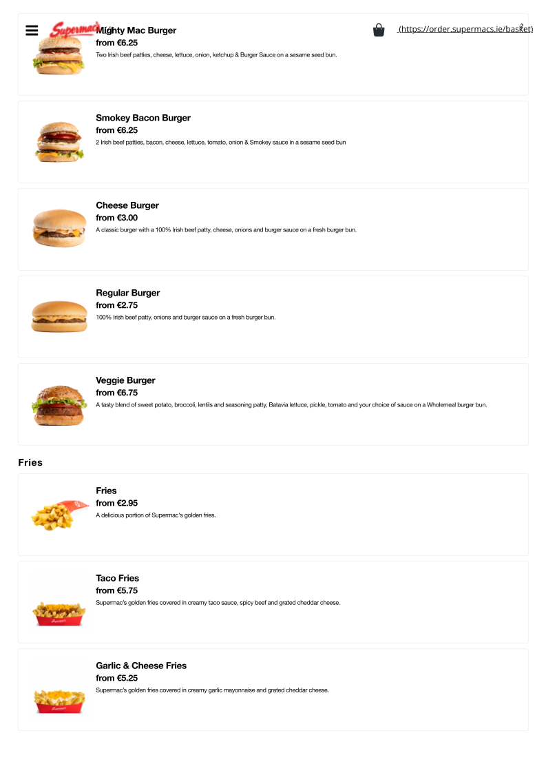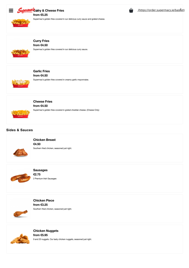 From a reviewer’s perspective, the menu at Supermac’s & Papa John’s Fermoy offers a broad and satisfying mix of fast-food classics and pizza specialties, making it ideal for both quick bites and group meals. The value-driven Papa’s Meal Deals, such as the “The Bargain Bundle Deal” and “Double Deal - Small with 2 Drinks and 4 Cookies”, stand out for their affordability and variety. The burger selection is equally appealing, with hearty options like the “Supermac's 5oz Bacon & Cheese Burger” and the larger “Supermac's 7.5oz Burger”, while chicken lovers can enjoy items like the “Chipotle Chicken Breast Sandwich” or “Chicken Wrap”. Sides such as “Taco Fries” and “Garlic & Cheese Fries” complement the mains well, and classic drinks like “Coca Cola” and “Sprite” round out the meal. On the pizza side, staples like “Margherita Pizza” and more indulgent options like “All The Meats” or “The Works” highlight Papa John’s influence. Desserts including “Hot Muffin & Ice Cream” and “Caramel Sundae” provide a sweet finish. Overall, while individual prices are not explicitly listed, the menu emphasizes variety, recognizable favorites, and value-focused deals that cater to a wide range of tastes.
